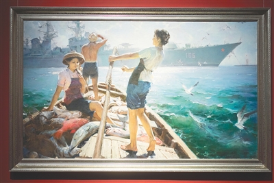 何岸的《西沙之晨》是其早期代表作品:近处是一艘满载而归的渔船,一名男子立于船头远眺,一女子端坐船舱内,另一女子的裤腿高高挽起,正在努力摇橹。远处,一艘军舰横贯画面,点明了保卫渔民安全与维护国家领海主权的主题。