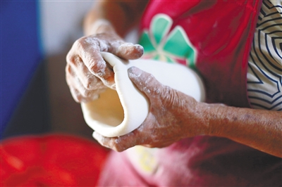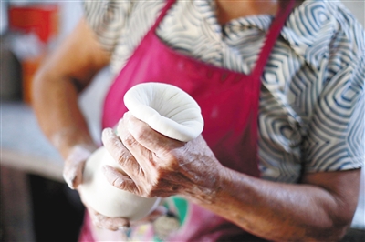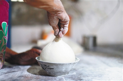 粗糙、指节凸出、遍布褶皱……岁月和生活双重刻画的痕迹在王朝蓉的手上格外显眼,这双手在案板上用力地来回推按、揉搓……