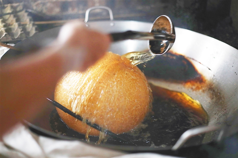 厨房内,一个大灶台占去三分之一面积,灶旁放着一对约一米长、手指粗细的竹竿,这就当筷子了,旁边还放着一柄长把大勺。灶内的火苗将油烧得热气蒸腾,刚刚制作好的空心糯米球滚入锅中,王朝蓉一手拿着竹筷轻轻固定,一手抄起长柄勺快速翻滚着面球并均匀淋油,不一会儿,糯米球被内部快速升温、膨胀的空气撑得浑圆,变成了Q弹薄脆的煎堆。