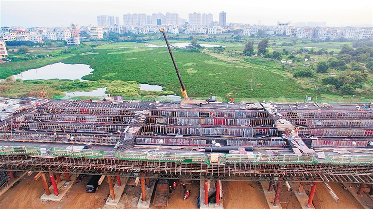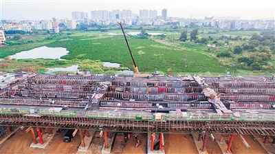 日前,海口海秀快速路二期工程施工现场,吊机耸立,机器轰鸣,工程车穿梭往来,一片繁忙,工程稳步推进,部分桥面已经铺设。