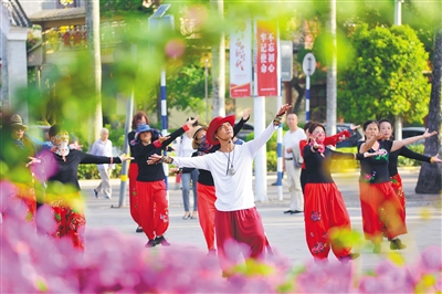 11月23日,琼海万泉河畔,“候鸟”一族在欢快的音乐中跳集体舞。