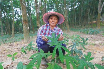 在对俄村,不时可见1米多高的野生五指毛桃。“听老人说,村里多年前就有一些野生的五指毛桃了,但以前不懂得它的经济价值。”该村村民符明志说。据悉,今年以来,在省内科研单位的建议与帮扶下,对俄村利用橡胶林的林下空间,共种植了1200亩五指毛桃,其中,960亩为企业示范种植基地,另外240亩为村集体经济。“管护成本不大,一年就能开挖。”陈红军介绍,这一产业至少可带动百余户建档立卡贫困户巩固脱贫成果。