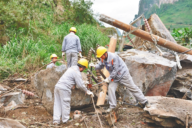 在广西崇左市大新县中信大锰大新锰矿分公司大锰矿区,工作人员抢修因地震受损的电力设备(11月25日摄)。