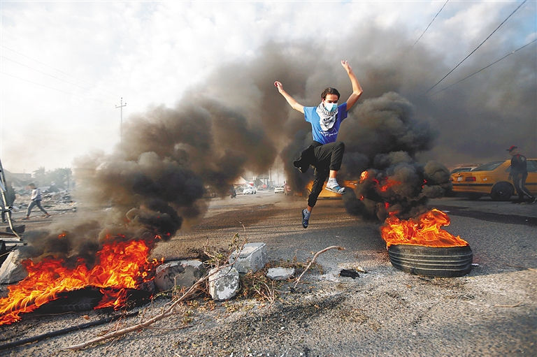 11月24日,在伊拉克巴士拉,一名抗议者跳过燃烧的轮胎。