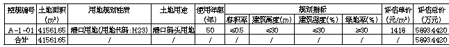 (一)挂牌出让宗地基本情况:本次挂牌出让宗地位于三亚崖州中心渔港控规A-1-01地块,CGCS2000国家大地坐标系面积41561.65平方米(海南平面坐标系面积41525.86平方米)。规划用地性质为港口用地(用地代码:H23)。用地四至及界址坐标详见地块勘测定界图。2019年三亚市人民政府以《关于三亚崖州中心渔港控规A-1-01地块用地具备净地出让条件的证明》证明控规A-1-01地块土地征收及“两公告一登记”工作已完成。三亚市崖州区人民政府已与被征地单位签订了《征用土地补偿协议书》,土地补偿款、安置补助费、青苗补偿费和地上附着物等款项已支付到位,相关征地材料现存于崖州区人民政府。目前地块上的附着物已清表、无法律经济纠纷、土地开发利用规划条件明确、符合土壤环境质量要求。地块周边可以满足施工建设所需的水、电供应,相关设备、机械可以进场施工。该宗地具备净地出让的条件。该宗地概况及规划指标等情况详见下表: