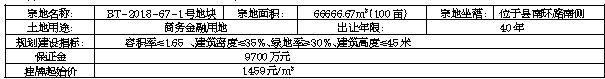 保亭黎族苗族自治县人民政府已经与被征地单位和被收回土地单位签订了《征用土地补偿协议书》和《收回土地补偿协议书》,土地补偿款、安置补助费、青苗补偿费和地上附着物等款项均已支付到位。目前BT-2018-67-1号地块无抵押、无查封、无法律经济纠纷,具备通水、通电、通路条件,土地开发利用规划条件明确,符合土壤环境质量要求。二、竞买人资格:(一)本次土地挂牌出让活动凡属中华人民共和国境内注册,良好的商业信誉和健全的财务会计制度,无不良经营纪录的具有独立法人资格企业,可申请参加竞买,但根据片区产业规划发展的要求,该宗地拟用于建设现代农业示范区,要求竞买人或其关联企业须与保亭黎族苗族自治县人民政府签订《战略合作协议》,且为《财富》杂志世界500强企业中的农业企业,或者与上述企业有现代农业示范区项目合作协议的企业。竞买人须承诺:如竞得该宗国有建设用地使用权后,应按照海南省自由贸易试验区(港)相关产业规划发展的要求开发建设。本次挂牌不接受联合竞买。(二)具有以下行为的竞买人不得参加本次土地挂牌出让:1.在保亭黎族苗族自治县范围有拖欠土地出让金行为,至今尚未付清的;2.在保亭黎族苗族自治县有闲置土地、低效利用土地、未按土地出让合同约定动工开发的、擅自改变土地用途等违法行为、未及时纠正的;3.被人民法院列入失信被执行名单和被税务系统列入重大税收违法案件联合惩戒名单的企业法人和个人。三、竞买规则:本次国有土地使用权挂牌出让设有底价,按照出价最高且不低于底价者得的原则确定竞得人。四、本次挂牌出让的详细资料和具体要求,见挂牌出让文件。申请人可于 2019年11月26日至2019年12月24日到保亭黎族苗族自治县自然资源和规划局或海南省公共资源交易服务中心一楼受理大厅3号窗口咨询获取挂牌出让文件。五、申请人可于2019年11月26日至 2019年12月24日到保亭黎族苗族自治县自然资源和规划局或海南省公共资源交易服务中心一楼受理大厅3号窗口提交书面申请。交纳竞买保证金的截止时间为2019年12月24日17时00分。经审核,申请人按规定交纳竞买保证金,具备申请条件的,我局将在2019年12月24日17时30分前确认其竞买资格。六、本次国有土地使用权挂牌活动在海南省政府会展楼二楼省公共资源交易服务中心土地交易厅进行。地块挂牌时间为: 2019年12月16日8时00分至2019年12月26日11时00分。七、开发建设要求:(一)竞得人须严格按照县规划部门批准的条件要求开发建设。(二)地块中须建设现代农业MAP服务中心、非物质文化遗产展览展示中心、农业商贸城(农资及农副产品交易中心)、现代农业院士专家工作站、植保中心、现代农业产学研基地和国际农业合作园。(三)非保亭注册的法人和其他组织应在竞得土地后五日内在保亭黎族苗族自治县注册成立全资项目子公司。(四)开发建设期限:建设项目须按国有土地出让合同中约定的开工建设和竣工时间执行,并从项目地块出让之日起40个月内要达到达产。(五)该地块投资强度要求为250万元/亩。(六)高新技术产品认定和科研成果发明专利需在保亭县申报。(七)建设项目需实施装配式建筑,实施建筑面积以与县住建部门签订的补充合同为准。八、其他需要公告的事项:(一)本次出让地块属商务金融用地,以现状土地条件挂牌出让。竞买人应当现场踏勘出让地块,申请参加竞买的,视为对出让地块现状条件无异议,地块涉及平整场地、清杂地上物资、地上地下电线路、光缆的迁移等费用由竞得人负责。(二)申请参加竞买的,视为认同《海南省产业项目发展和用地准入协议》,参考范本请参阅原海南省国土资源厅等七部门《关于实施产业项目发展和用地准入协议的指导意见》(琼国土资规〔2018〕8号)。(三)本次出让宗地成交后,竞得人必须在签订《成交确认书》的10日内,分别与项目产业主管部门县农业农村局和县自然资源和规划局签订该项目《海南省产业项目发展和用地准入协议》和《国有建设用地使用权出让合同》,准入协议是签订国有土地使用权出让合同的前提条件。不按期签订准入协议或出让合同的,视为竞得人自动放弃成交权力,竞得人应承担相应法律责任。(四)竞得人从国有建设用地使用权出让合同生效之日起60日内付清土地出让金(已缴交的保证金可抵充土地出让金)。(五)本次成交价款不包括各种税费(相关税费由双方按规定缴纳),挂牌佣金由竞得人按有关规定支付。(六)竞得人取得土地使用权后,应严格按照规划要求建设,涉及绿化、环保、消防、交通管理等应符合国家和海南省的有关管理规定。(七)本次竞买活动进行现场书面报价,不接受电话、邮寄、电子、口头报价。(八)本次挂牌出让事项如有变更、届时以变更公告为准。九、联系方式:联系地址:海南省保亭黎族苗族自治县保兴中路园林巷、海南省公共资源交易服务中心一楼受理大厅3号窗口。联系人:邢先生 杨先生 刘先生;联系电话:0898-83666228 65303602 18976212356。查询网址:http://zw.hainan.gov.cn/gg