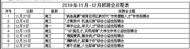 由海口市人力资源开发局全新打造的就业超市——海口市人力资源市场开业啦!现定于 2019年11月—12月每周一、三、五上午9:00-12:00举办公益性常规招聘会。
