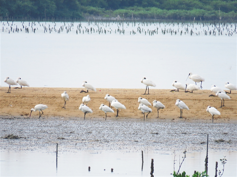 图为黑脸琵鹭在东方黑脸琵鹭省级自然保护区水岸边栖息。通讯员 赵振标 摄