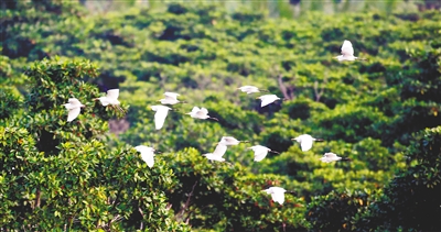 和着太阳鸟的歌声,一只只柳莺在红树林的枝叶间跳来蹦去,扯着圆润的嗓子不停地有节奏地叫唤着“仔儿”“仔儿”。深一声,浅一声,不远处滩涂上的鹭鸟们听见了,也兴奋地叫了起来。