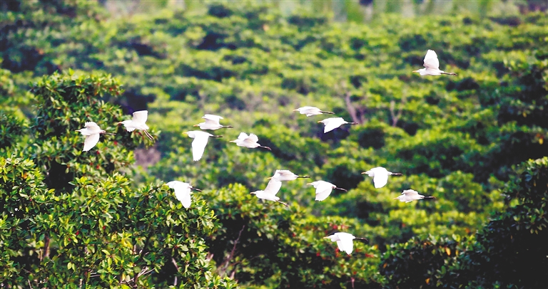 突然,一只黑鸢从高空俯冲而来,边飞边鸣,似吹哨般,吓跑灌木丛里觅食的暗绿绣眼鸟,惊起几只正在滩涂上嬉戏的红腹滨鹬。一阵“扑棱”声后,黑鸢饱餐鲜肥鱼虾,满足离去,沉寂片刻的东寨港瞬间恢复喧闹。