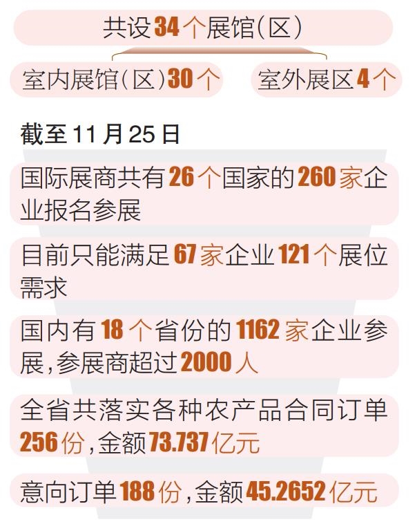 据了解,本届冬交会展区包括“一带一路”沿线国家展区、国际农产品品牌馆、农业产业扶贫展销馆、中国农业品牌馆、农业装备展区、美食街、品牌宣传街、网红品牌街。