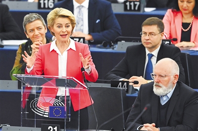 在投票前,冯德莱恩在欧洲议会发表演讲,介绍新一届欧委会的政策主张及分工情况。她强调了此前提出的一些政策主张,包括加强欧盟的战略自主性、大力推行“绿色新政”以应对气候变化等。