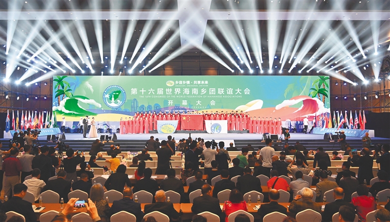 “五指山的情,万泉河的意,使我们同欢聚,让我们话桑麻……”世界海南乡团联谊大会举办30年来,本届大会参会会员国家和地区最多、参会乡团最多、参会的乡亲最多。开幕式现场,萦绕全场的会歌,唱出了每一位海南乡亲的心声。