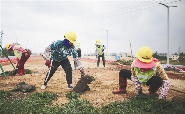 近日,工人们在海口市江东大道(二期)生态长廊建设项目铺种草坪。据了解,该项目道路全长15096米,宽80米,规划红线80米。建设内容包括道路工程、绿化及绿化给水工程、排水工程、园建工程、交通工程、涵洞工程、海绵工程、照明工程等。