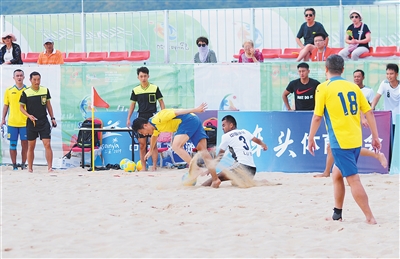 比赛怎么办?运动员参赛体验感如何?这些问题随着职沙会沙滩足球比赛项目的推进,让亚沙会组委会的工作人员对于各项数据的实时记录和掌握,显得信心满满。“你看大东海这个沙子,特别适合沙滩运动,参赛队员没有任何不适,都觉得很舒服。”比赛队员的切身体验验证了大东海沙子的质量。在当天进行的沙滩足球八进四一场比赛中,中国铁警代表队轻松击败了青岛海关队,中国铁警队领队郭化肯定了大东海的沙子质量,“我们的队员大部分是北方球员,为了能快速适应三亚的场地,我们还专门在海口的沙滩上训练,”郭化说,良好的比赛场地让球员做动作更加放得开。