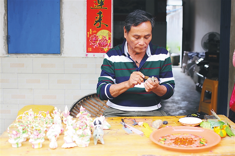 周岁粿是一门需要耐心的手艺,一套周岁粿制作耗时五六个小时,用程祝永的话说,“我能坐得稳所以做得来。”正是“坐得稳”,兄弟三人里只有他将这门手艺传承了下来;也正是“坐得稳”,他制作的周岁粿活灵活现、惟妙惟肖。程祝永没有任何美术功底,但观察能力极强的他却能在看过一项物品之后抓住特点并将其以周岁粿的形式复刻出来。留心观察加上熟能生巧,他制作的周岁粿越来越“灵”。最初,程家周岁粿只在附近的村镇小有名气,随着越来越多的外嫁女走出小镇,程祝永的周岁粿被更多人所了解,甚至有人从文昌、乐东等市县慕名来到岭口请他制作周岁粿。