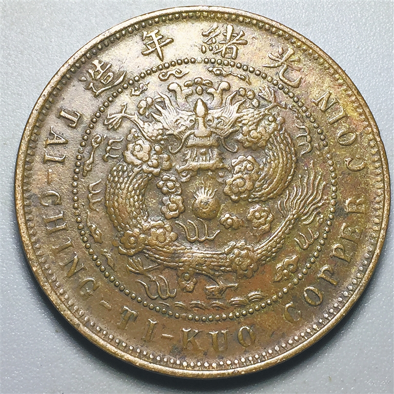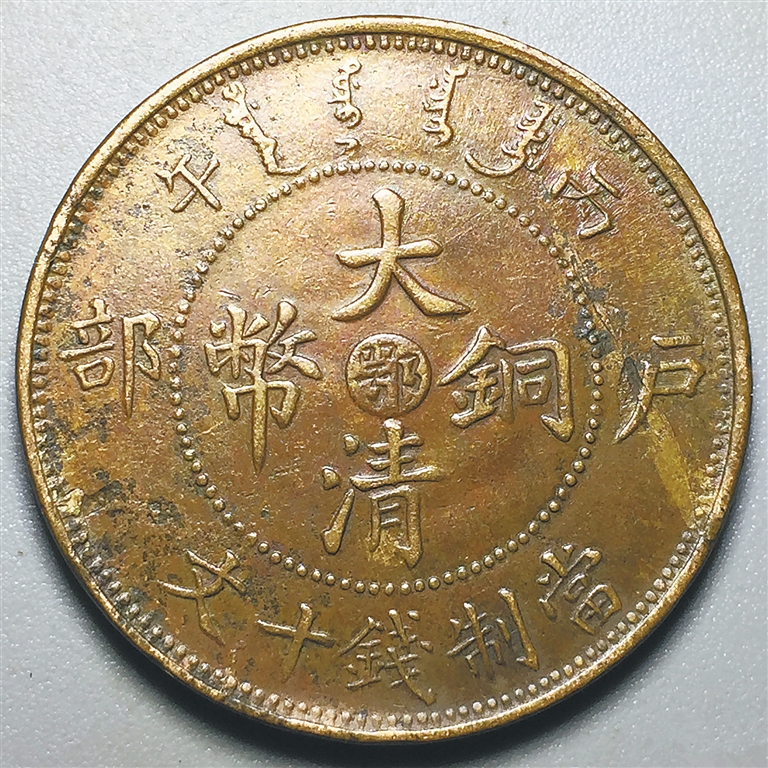 流通铜元的面文主要是光绪元宝和大清铜币两类,每一类又有一文、二文、当五、当十、当二十多种面值。市面上最常见的铜元为湖北省造,产量约占到全国的三分之一。当时的湖北是由洋务派的又一健将张之洞坐镇,他实行湖北新政,积极发展近代化工业,使武汉“驾乎津门,直追沪上”,所以湖北铜元异军突起都在情理之中。湖北铜元的版式极为繁多,光绪元宝币心就有五瓣花、六瓣花、八瓣花之分;龙纹有水龙、坐龙、小胖龙和跳龙纹等,仅坐龙又有大龙、特大龙等,水龙又分为龙身有云或无云、爪在须外或须内等。大清铜币中心多为阴刻的湖北简称“鄂”字,龙纹又分为部颁龙、仿部颁龙、带冠龙等,仅带冠龙根据冠的数量又分为不同品种,其中部颁龙指的是清朝户部颁发的大清铜币的标准龙纹,地方省份的铸钱局也多用此种龙纹铸币。