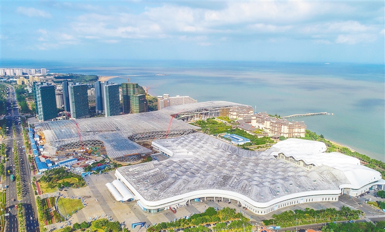 12月1日,高空航拍地下主体结构完成的海南国际会展中心二期项目,造型宛如“钢铁海鸥”。 据了解,该项目分为南北两个馆,总建筑面积约为19.86万平方米,建成后将成为国内领先的现代化绿色智能会展场馆。目前该项目进展顺利,其屋面网架已完成安装,南区北区的铝板幕墙和玻璃幕墙开始安装,预计今年年底项目外立面的铺装能够完成。