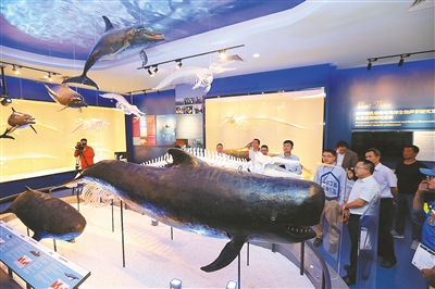 12月2日,观众在位于三亚的中国科学院深海科学与工程研究所鲸豚标本馆参观。 当天,中科院深海所鲸豚标本馆举行开馆仪式,海洋生态科普展同时开幕。鲸豚标本馆目前展出了6个鲸类物种共22副标本。馆内由展板以及多媒体设备配合标本,立体展现鲸类动物的演化历程、各物种的生物学特征等科普信息,让参观者更直观了解鲸类动物及其研究工作,提高民众对海洋珍稀动物和海洋生态环境的保护意识。