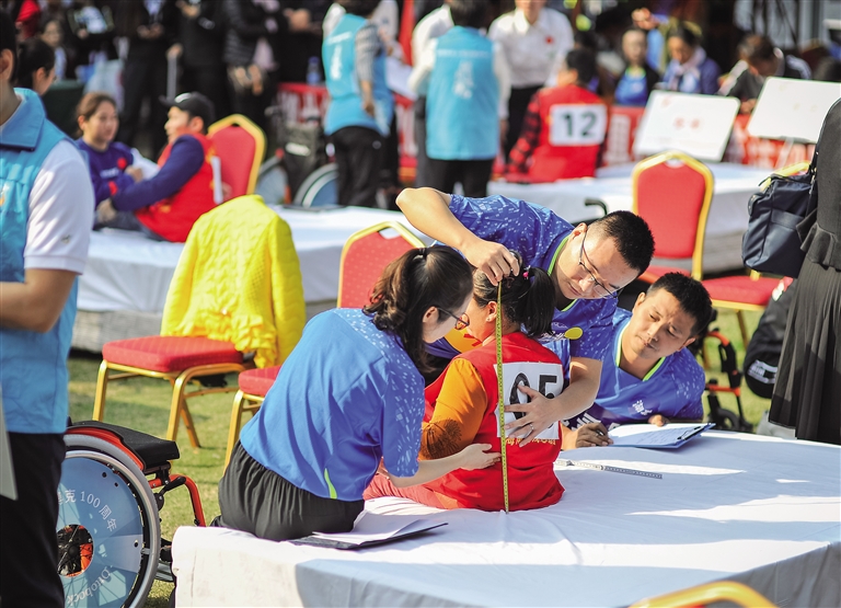图为参赛选手给残疾人测量上身数据,以选择合适的义肢。