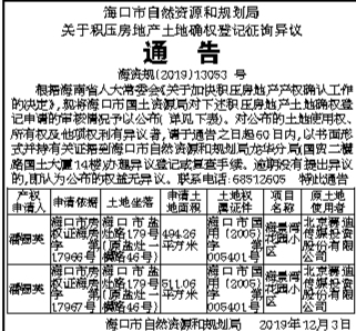海口市自然资源和规划局关于积压房地产土地确权登记征询异议
