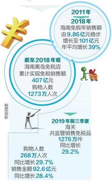 数字见证免税政策对吸引消费回流、带动我省旅游消费经济增长的长足潜力。据海口海关统计,2019年前三季度海关共监管销售免税品1276万件,同比增长29.2%;购物人数268万人次,同比增长29.7%;销售金额92.6亿元,同比增长28.4%。