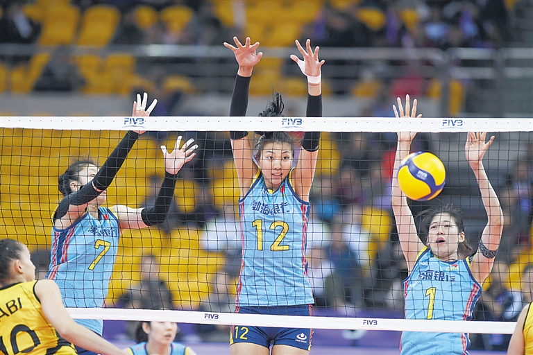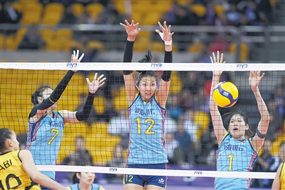 12月6日,在绍兴进行的女排世俱杯决出四强。B组的天津渤海银行队0:3不敌土耳其瓦基弗银行队,A组的广东恒大队0:3不敌土耳其伊萨奇巴希队,中国参赛的两支俱乐部队皆无缘四强。图为天津渤海银行队球员李盈莹、袁心玥、杨艺(从右至左)在比赛中拦网。 新华社发