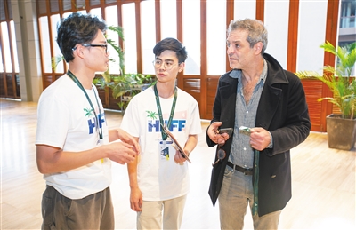 12月7日,在第二届海南岛国际电影节电影展映影院,志愿者正在为嘉宾提供带领、咨询及翻译服务。
