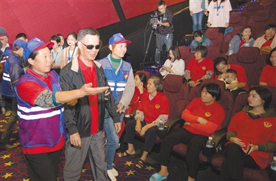 12月5日,视障人士在志愿者的协助下走进影院,欣赏无障碍电影《建国大业》。