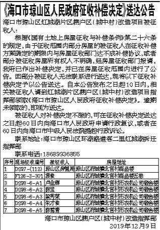 《海口市琼山区人民政府征收补偿决定》送达公告