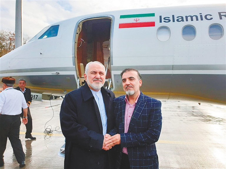 这张发布在伊朗外交部长穆罕默德·贾瓦德·扎里夫社交媒体账号上的照片显示,12月7日,他与伊朗籍科学家马苏德·苏莱曼尼(右)在瑞士苏黎世机场合影,准备飞往伊朗德黑兰。