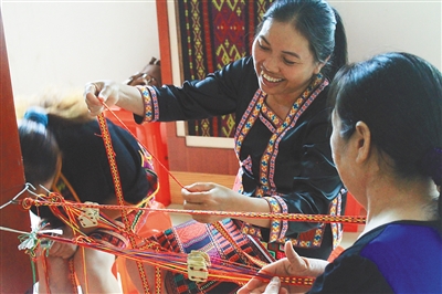 “俄乐村妇女素有编织黎锦的技艺传统。两年前,我们成立合作社发展黎锦手工艺传承项目,鼓励贫困户参与,并通过培训提升妇女织锦技艺。” 东方市大田镇俄乐村第一书记景春林说,为了让古老的黎锦焕发出新生活力,村民们织造了背包、餐具垫、鼠标垫等生活化的黎锦产品。今年1月,海南一家文化传媒公司跟俄乐村签订了3.5万元的合同,下了500件鼠标垫的订单,到年底村里将按劳分配,把收入分给参与织锦的贫困户和村民。