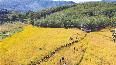 时间往前推移半个多月,在白沙青松乡拥处村,苍翠群山间,漫山遍野都是金黄色的山兰稻,山谷间一片稻香。11月17日,2019年“啦奥门”山兰文化节在白沙青松乡举行,八方宾朋受邀前来白沙吃新米、喝山兰酒、观赏非遗展示,共享山兰稻丰收的喜悦。