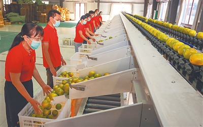 12月10日,在白沙七坊镇农产品供应站,工人将分拣流水线自动筛选出的一个个红心橙打包、装车,这些品质优良的红心橙将通过便捷的物流,送到万千百姓家的“果篮子”里。