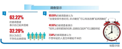 调查显示,83.55%的被调查者认为“合理安排作息时间,早点睡觉”可以有效改善“起床困难症”,41.55%的被调查者表示“给早上安排紧急的任务,迫使自己起床”可以激励早起,也有一些被调查者认为不想早起的人是怎样都起不来的。