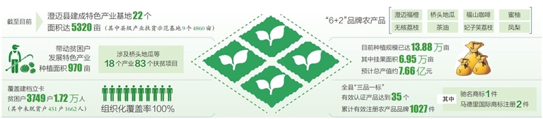 截至目前,澄迈县建成特色产业基地22个,面积达5320亩(其中县级产业扶贫示范基地9个4860亩),带动贫困户特色产业种植面积970亩,涉及桥头地瓜、无籽蜜柚、山柚油、白莲鹅等18个产业83个扶贫项目,覆盖建档立卡贫困户3749户1.72万人(其中未脱贫户451户1662人),组织化覆盖率100%。