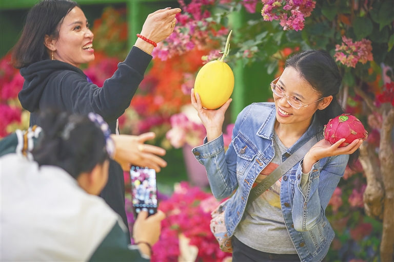 ③ 12月13日,2019年冬交会海南林业馆,各色花朵、蔬果“引得游人醉”,一位市民拿着水果和花留影。