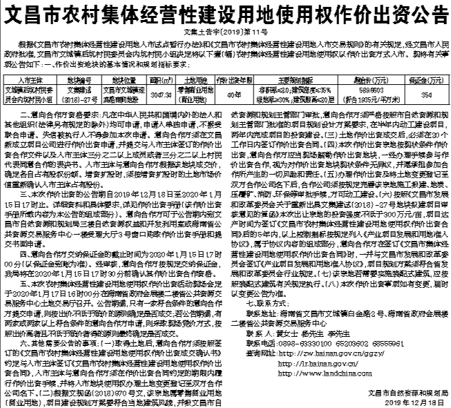 文昌市农村集体经营性建设用地使用权作价出资公告