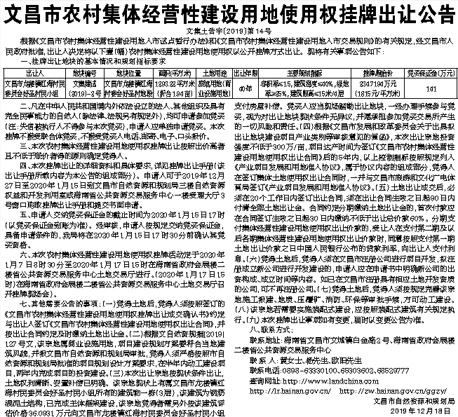 文昌市农村集体经营性建设用地使用权挂牌出让公告
