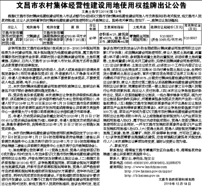 文昌市农村集体经营性建设用地使用权挂牌出让公告