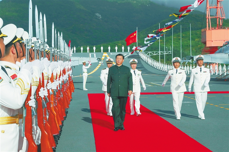 随后,习近平登上山东舰,检阅仪仗队。习近平察看有关装备,了解舰载机飞行员工作生活情况。习近平前往驾驶室,同官兵亲切交流,在航泊日志上郑重签名。