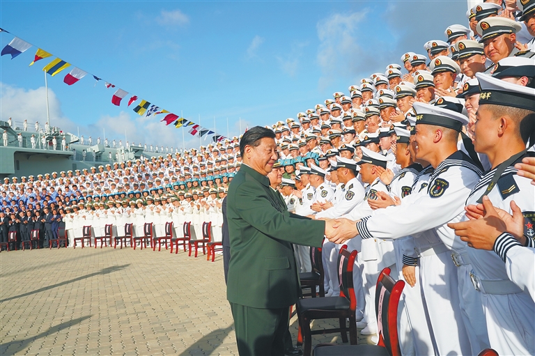 南海之滨的三亚,水天一色,日暖风清。军港内,山东舰伏波静卧、满旗高悬,来自海军部队和航母建设单位的代表约5000人在码头整齐列队,气氛隆重热烈。