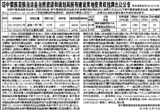 琼中黎族苗族自治县自然资源和规划局国有建设用地使用权挂牌出让公告