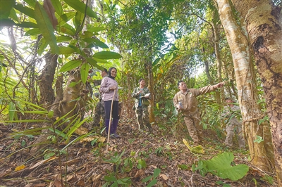 “5株槟榔、10株橡胶、14株益智……”12月19日下午,在白沙黎族自治县南开乡高峰村的高山森林里,高峰村生态搬迁资源调查组组员们正在清点村民符小花家种植在山岭上的橡胶、菠萝蜜、槟榔、益智等作物,为高峰村的生态搬迁青苗补偿做准备。