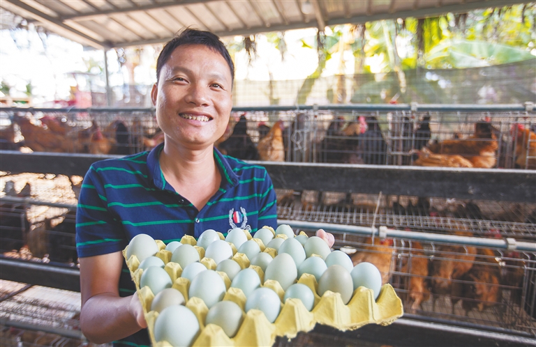 ⑥ 三亚育才生态区马脚村村民董黄强在政府及爱心企业的帮助下,在庭院里建起鸡舍养殖绿壳蛋鸡,目前已有200余只,每天能产60余个绿壳鸡蛋,月均收入3000余元,今年已经脱贫。图为12月18日,董黄强展示自家蛋鸡产出的绿壳鸡蛋。