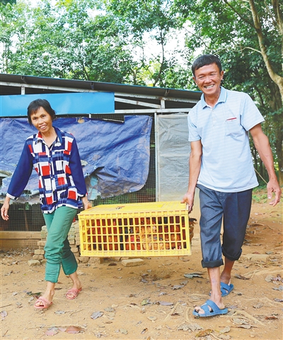 ② 12月19日,屯昌县南吕镇落根村脱贫户陈有英和妻子将鸡装笼出售。凭借政府出资搭建的养鸡棚以及5000元的产业扶持资金,陈有英今年养殖200多只阉鸡,纯收益超过1万元。