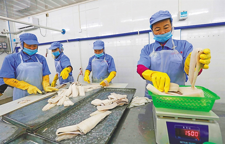 ⑤ 12月19日,在儋州海头镇一片海渔业专业合作社加工厂务工的贫困户忙着加工海产品。该合作社目前已吸纳贫困户400余户1000多人。