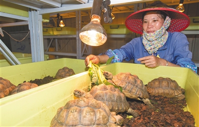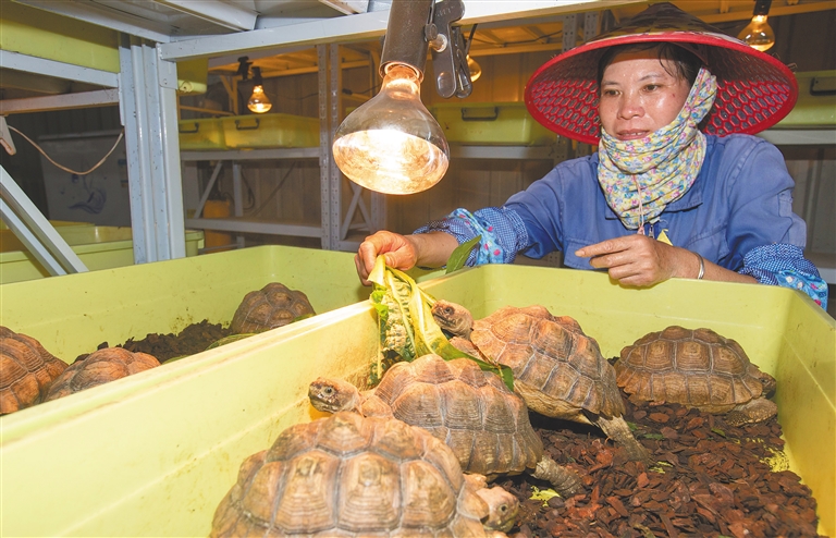 ① 12月19日,在陵水黎族自治县文罗镇老杨村陵水健丰养殖专业合作社养殖基地,贫困户符小约在给陆龟喂食。 2018年,文罗镇与该合作社签订协议,以“专业合作社+贫困户”的模式,发展苏卡达陆龟养殖产业,帮助该镇692户贫困户稳步、可持续地增收脱贫。