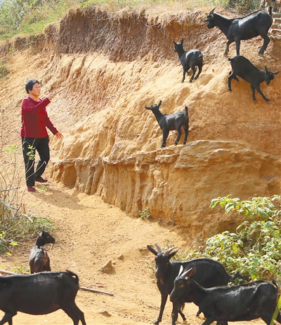 ③ 12月19日,澄迈县老城镇大场村脱贫户庄月春在放羊。2016年被纳为建档立卡贫困户后,庄月春在当地政府的帮扶下,开始饲养黑山羊和黄牛。如今,家中黑山羊存栏量达50只、黄牛4头,年收入2万元左右。