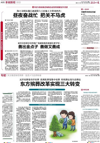 “成效非常显著!东方全市‘三沿七区’可视范围内已经看不到坟墓了。”朱孙益表示,殡葬改革启动至今,东方市基本实现由无序安葬向有序安葬、由乱埋乱葬向集中安葬、由传统葬法向生态葬法的转变。